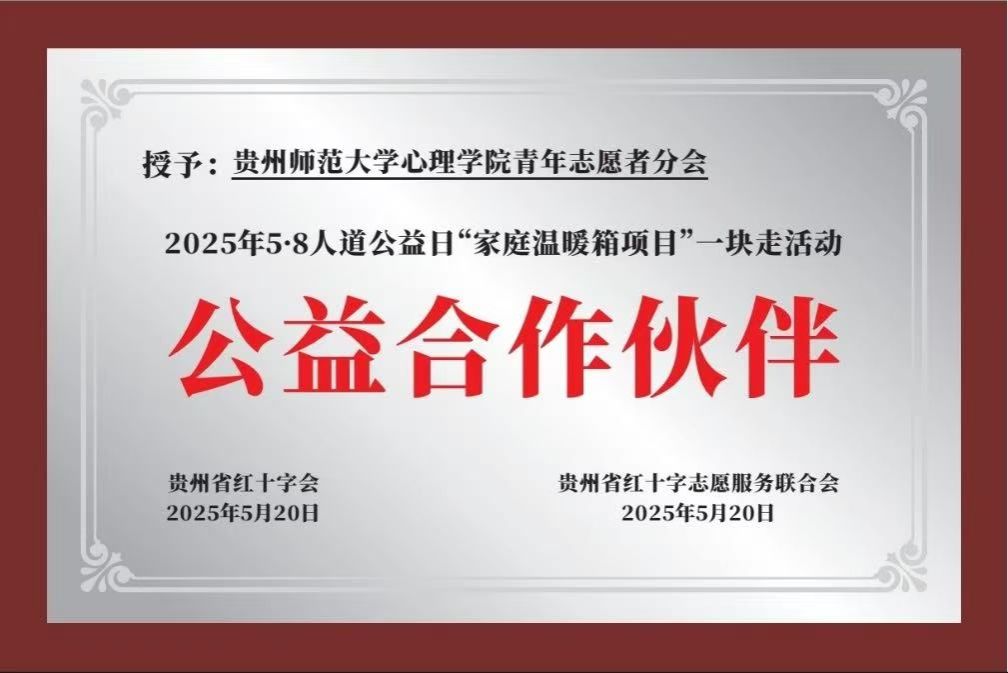 热烈祝贺心理学院青年志愿者分会在由贵州省红十字会与贵州省红十字志愿服务联合会牵头开展的“2025年5·8人道公益日“家庭温暖箱项目”一块走活动”中荣获“公益合作伙伴”称号。