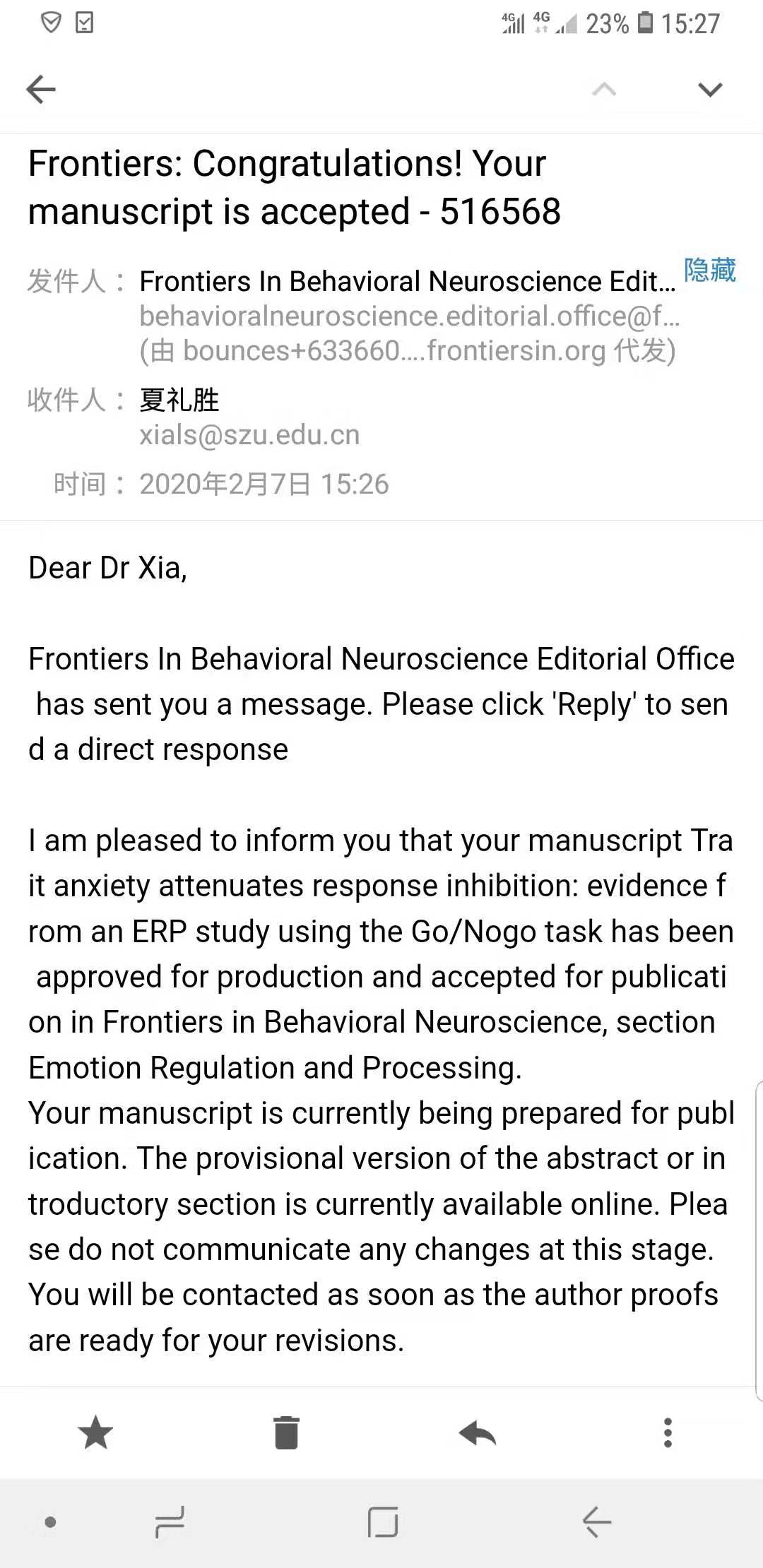祝贺夏礼胜老师的文章被Frontiers in Behavioral Neuroscience(SCI中科院三区)正式录用。贵州师范大学心理学院是第一作者单位。