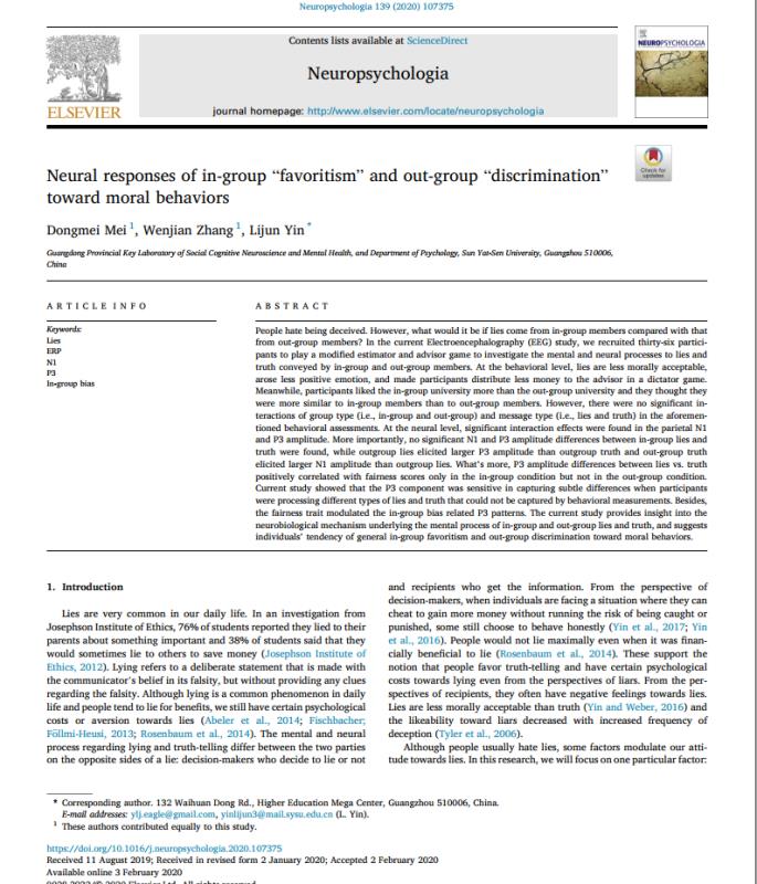 祝贺梅冬梅老师作为第一作者在SSCI期刊《Neurpsychologia》(影响因子2.872)发表了题目为“Neural responses of in-group“favoritism”and out-group“discrimination”toward moral behaviors”的研究论文(https://doi.org/10.1016/j.neuropsychologia.2020.107375)。