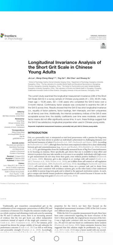 祝贺学院罗杰老师作为第一作者和第一单位在SSCI期刊《Frontiers in psychology》(影响因子2.089)发表了题为“Longitudinal Invariance Analysis of the Short Grit Scale in Chinese Young Adults”的研究论文(DOI = 10.3389/fpsyg.2020.00466)。
