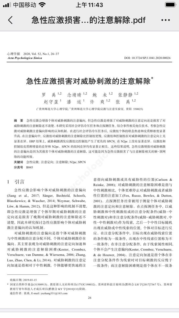 祝贺罗禹副院长等老师在心理学A类权威期刊《心理学报》2020年第一期发表了题为《急性应激损害对威胁刺激的注意解除》的文章。