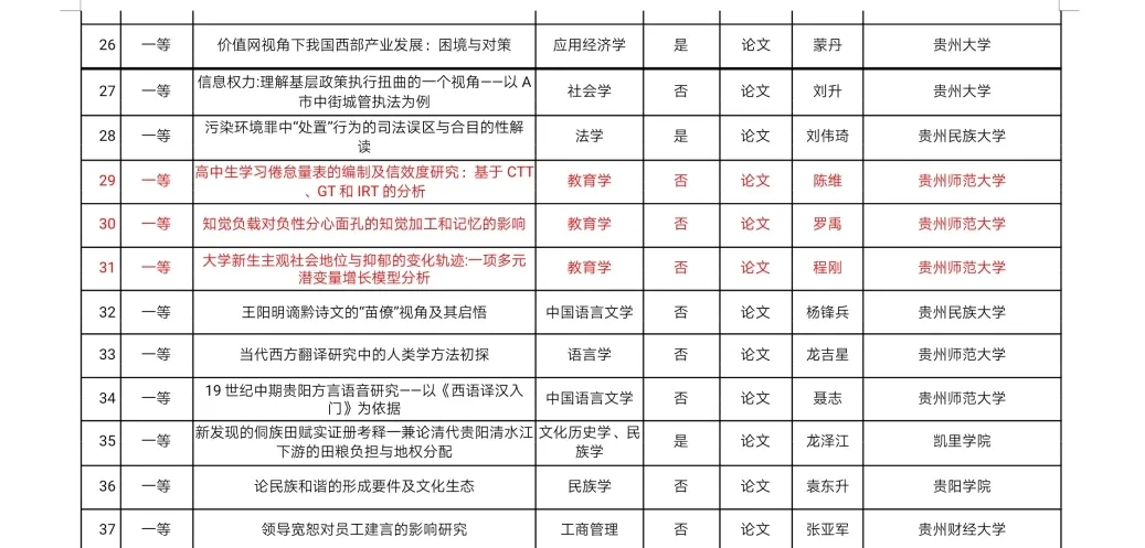 祝贺陈维、罗禹、程刚三位老师获第四届贵州省高校人文社会科学研究优秀成果奖一等奖。
