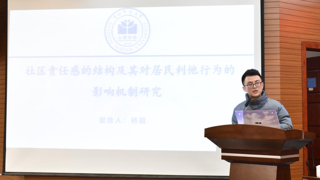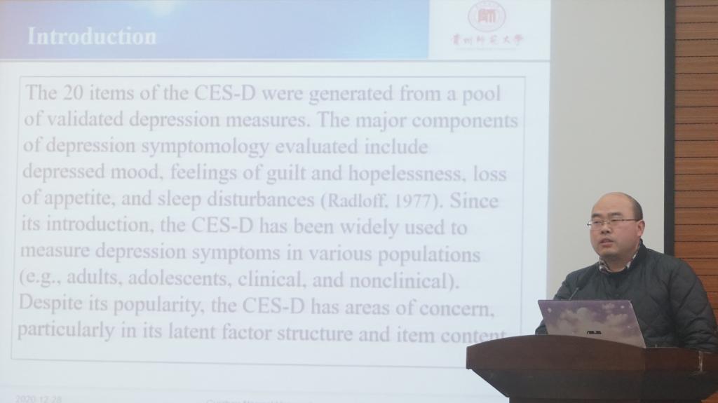 学术交流环节阶段,主要以“‘十四五’时期贵州省社会心理服务体系完善与提升”为主题展开交流研讨。贵州师范大学心理学院罗杰老师、杨超老师分别作了《Factor structure of the Center for Epidemiological Studies Depression Scale (CES-D):An exploratory structural equation modeling》和《社区责任感的结构及其对居民利他行为的影响机制研究》的主题报告。