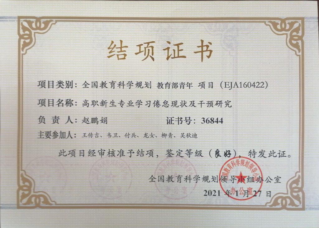 祝贺我院赵鹏娟老师的“全国教育科学规划 教育部青年 项目”顺利结项,并被鉴定为“良好”等级。