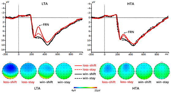 研究分析了高低焦虑组在win-stay, win-shift, loss-stay, loss-shift下的脑电特征及行为-脑电相互关系,并分别对表征结果预期FRN和信息更新P3这两种核心脑电成分进行了溯源分析。结果表明,相对于低焦虑人群,高焦虑人群往往对结果预期更加悲观,面对负性结果时更不愿意及时调整以止损。