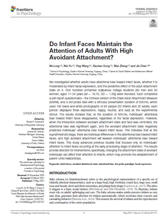 6.龙女讲师作为第一作者,陈加讲师作为通讯作者,在SSCI二区期刊《Frontiers in Psychology》发表了题为“Do Infant Faces Maintain the Attention of Adults With High Avoidant Attachment”的学术论文。