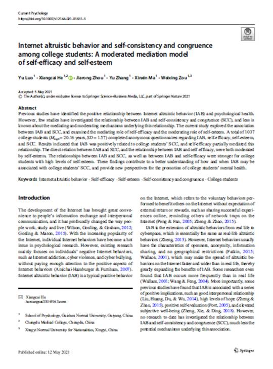 2.罗禹副教授作为第一作者,在SSCI JCR二区期刊Current Psychology发表了题为“Internet altruistic behavior and self-consistency and congruence among college students: A moderated mediation model of self-efficacy and self-esteem”的学术论文。