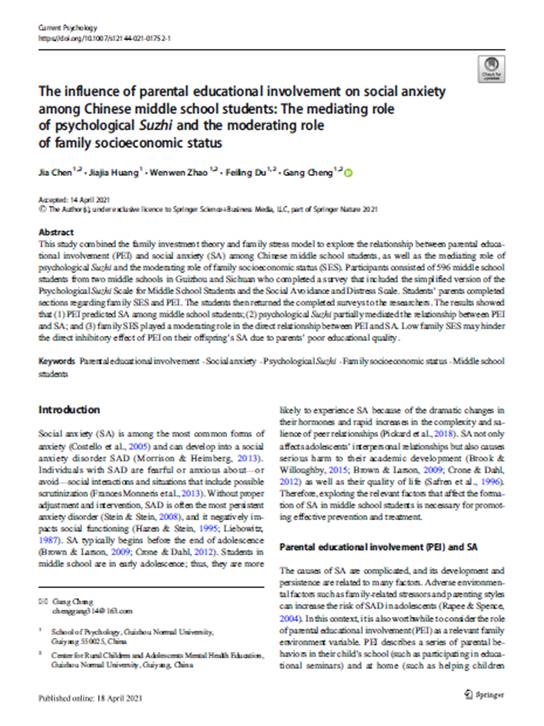 5.陈加讲师作为第一作者,程刚副教授作为通讯作者,在SSCI二区期刊《Current Psychology》发表了题为“The influence of parental educational involvement on social anxiety among Chinese middle school students: The mediating role of psychological Suzhi and the moderating role of family socioeconomic status”的学术论文。