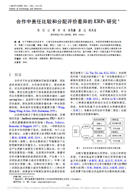 13.陈衍副教授作为第一作者,在CSSCI期刊《心理与行为研究》发表了题为“合作中责任比较和分配评价差异的ERPs研究”的学术论文。