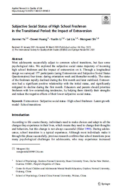 8.2017级硕士研究生叶建梅作为第一作者,史梦薇副教授作为通讯作者,在SSCI三区期刊《Applied Research in Quality of Life》发表了题为“Subjective Social Status of High School Freshmen in the Transitional Period: the Impact of Extraversion”的学术论文。