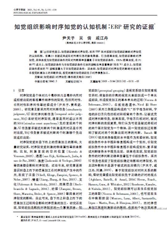15.尹天子副教授作为第一作者在CSSCI期刊《心理学探新》发表了题为“知觉组织影响时序知觉的认知机制:ERP研究的证据”的学术论文。