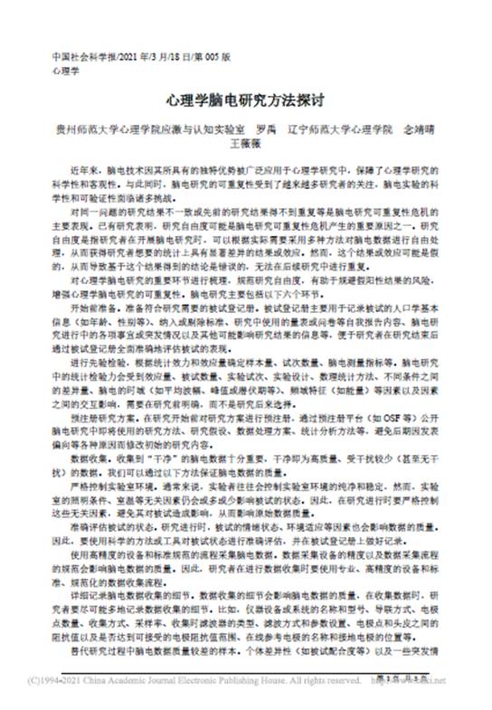 12.罗禹副教授作为第一作者,在重要报刊《中国社会科学报》理论版,发表了题为“心理学脑电研究方法探讨”的学术论文。