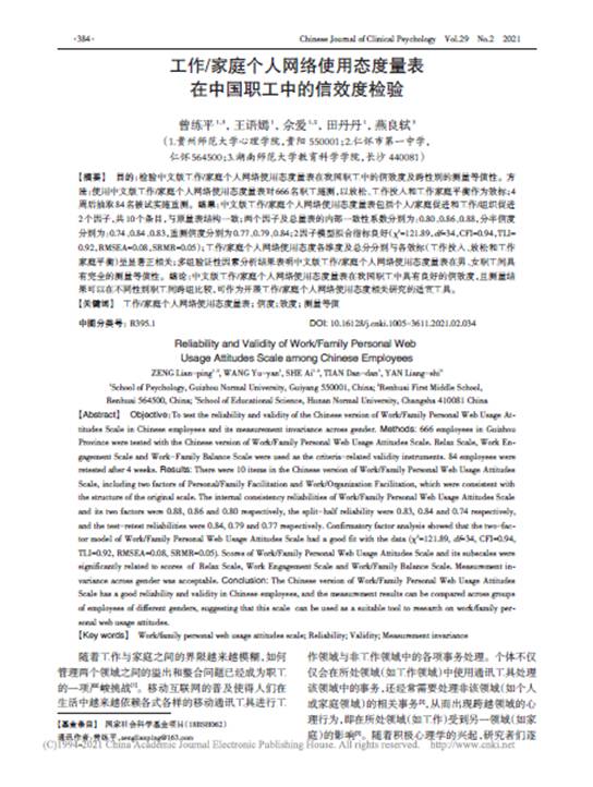 16.曾练平副教授作为第一作者,在CSSCI期刊《中国临床心理学杂志》发表了题为“工作/家庭个人网络使用态度量表在中国职工中的信效度检验”的学术论文。