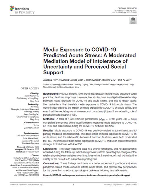 7.2019级博士研究生何相材作为第一作者,罗禹副教授作为通讯作者,在SSCI二区期刊《Frontiers in Psychiatry》发表了题为“Media exposure to COVID-19 predicted acute stress: A moderated mediation model of intolerance of uncertainty and perceived social support”的学术论文。