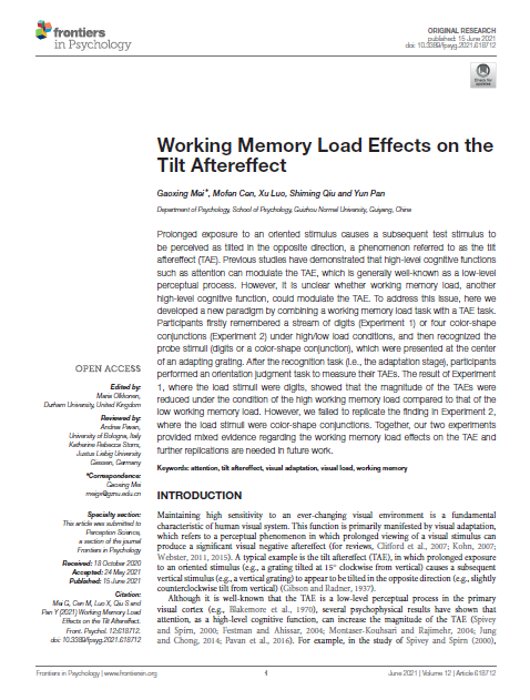 4.梅高兴副教授作为第一作者,在SSCI二区期刊《Frontiers in Psychology》发表了题为“Working Memory Load Effects on the Tilt Aftereffect”的学术论文。