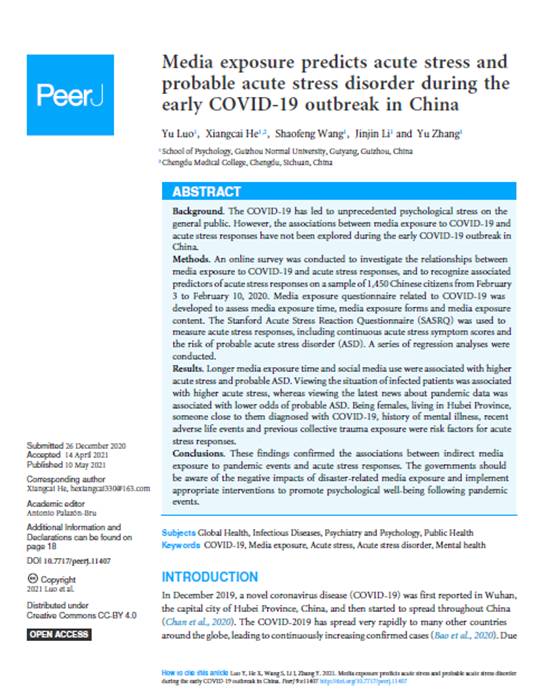 1.罗禹副教授作为第一作者,在SCI JCR二区期刊《PeerJ》发表了题为“Media exposure predicts acute stress and probable acute stress disorder during the early COVID-19 outbreak in China”的学术论文。