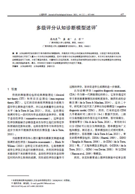 10.高旭亮博士作为第一作者,在CSSCI期刊《心理科学》发表了题为“多级评分认知诊断模型述评”的学术论文。
