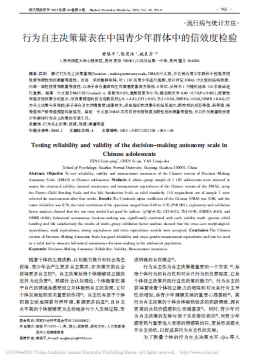23.曾练平副教授作为第一作者,在中文核心期刊《现代预防医学》发表了题为“行为自主决策量表在中国青少年群体中的信效度检验”的学术论文。