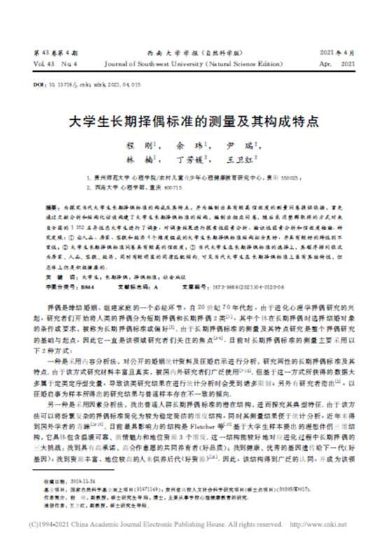 20.程刚副教授作为第一作者,在核心期刊《西南大学学报(自然科学版)》发表了题为“大学生长期择偶标准的测量及其构成特点”的学术论文。