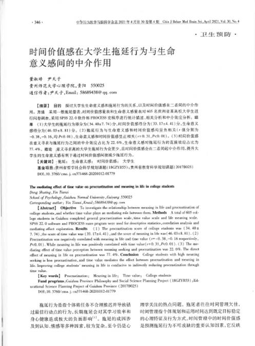 19.2018级硕士研究生董淑婷作为第一作者,尹天子副教授作为通讯作者,在CSCD期刊《中华行为医学与脑科学杂志》发表了题为“时间价值感在大学生拖延行为与生命意义感间的中介作用”的学术论文。