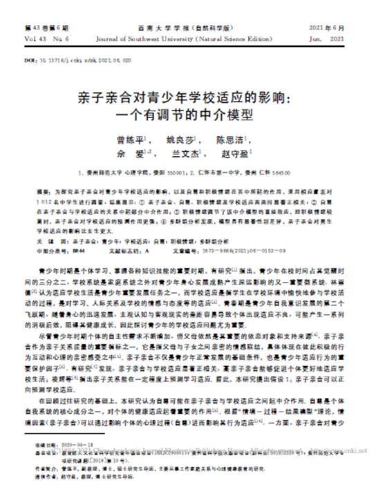 21.曾练平副教授作为第一作者,赵守盈教授作为通讯作者,在核心期刊《西南大学学报(自然科学版)》发表了题为“亲子亲合对青少年学校适应的影响:一个有调节的中介模型”的学术论文。