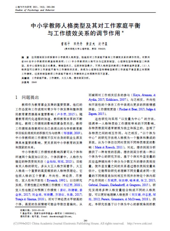 14.曾练平副教授作为第一作者,赵守盈教授作为通讯作者,在CSSCI期刊《心理与行为研究》发表了题为“中小学教师人格类型及其对工作家庭平衡与工作绩效关系的调节作用”的学术论文。