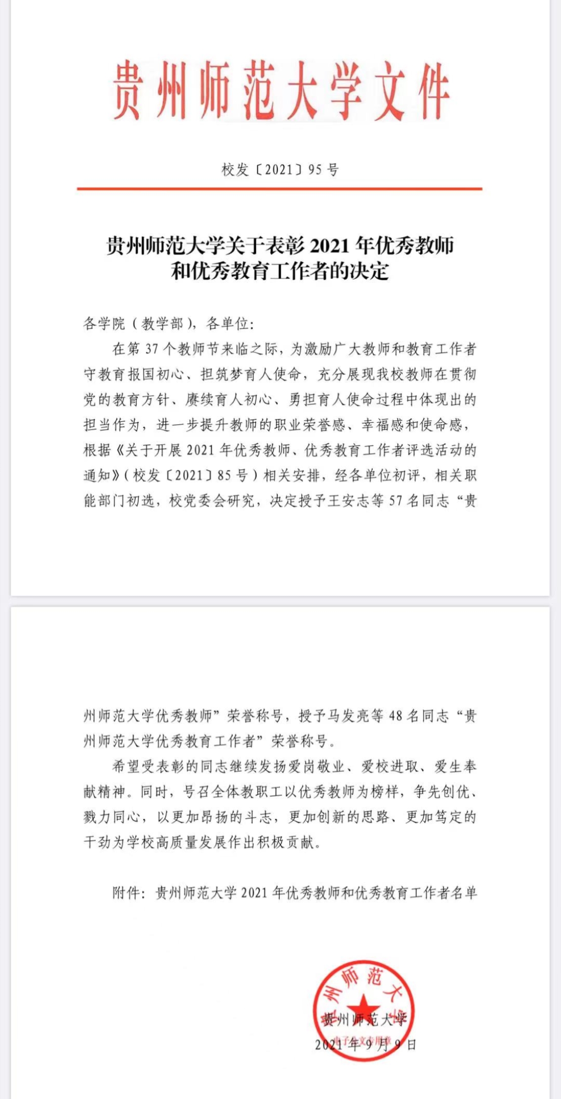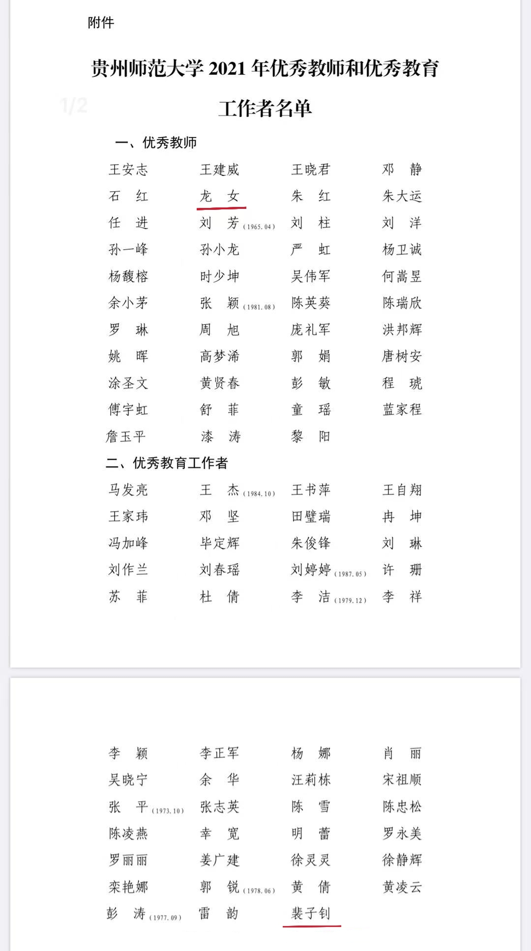 热烈祝贺我院龙女老师获2021年度优秀教师荣誉称号,裴子钊老师获2021年度优秀教育工作者荣誉称号!
