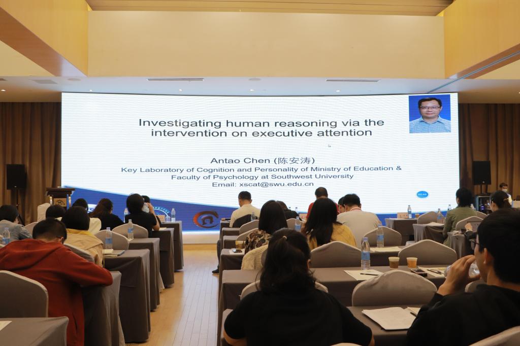 西南大学陈安涛教授因疫情防控原因未到现场,通过视频分享了他的报告《Investigating human reasoning via the intervention on executive attention》,发现个体通过执行注意的训练,能影响他们的关系整合能力,可以提高个体的流体智力、瑞文推理任务的表现。
