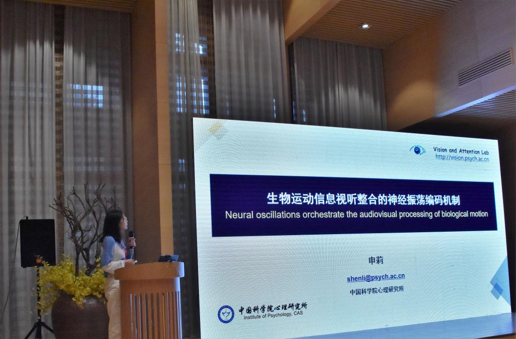 中国科学院心理研究所申莉博士作了题为《生物运动信息视听整合的神经振荡编码机制》的报告。研究发现初步揭示了神经振荡编码在加工及整合多模态生物运动信息中的重要作用。