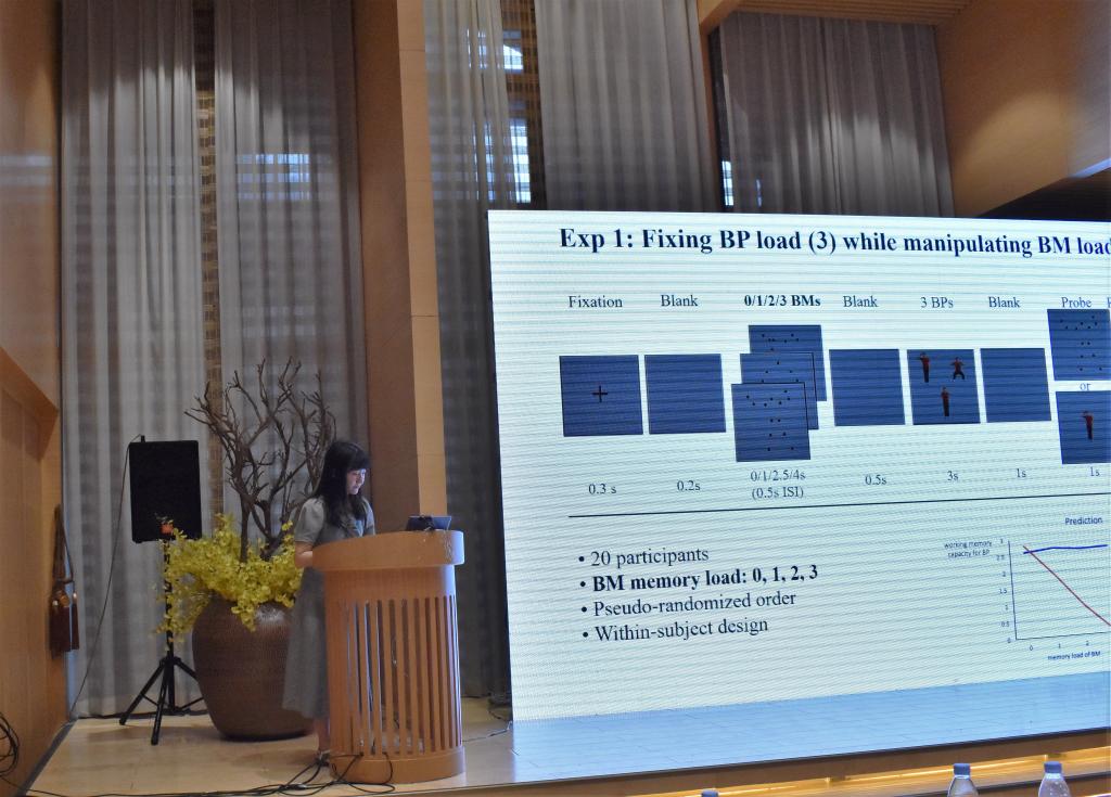 浙江大学赵苑秀博士作《Biological movement is stored independently from body posture in working memory》报告。该报告指出生物运动和身体姿势在工作记忆存储中不存在资源竞争,两者不共享同一个存储缓冲区,这可能是因为两者在工作记忆中存在不同的表征和复述机制。