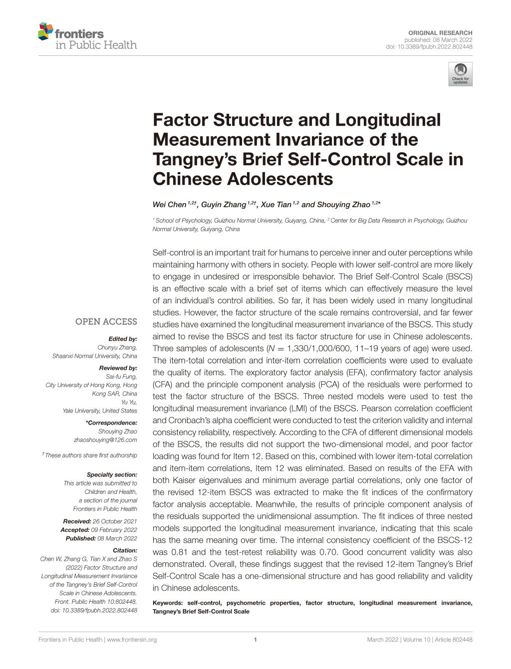 2.硕士研究生张谷吟与陈维教授作为共同第一作者,赵守盈教授(副校长)作为通讯作者,2022年3月在SSCIJCR一区期刊《Frontiers inPublicHealth》发表了题为“Factor Structure and Longitudinal Measurement Invariance of the Tangney’s Brief Self-Control Scale in Chinese Adolescents”的学术论文。论文主要在国内青少年群体中修订了简式自我控制量表,并检验了它的信效度以及纵向不变性。