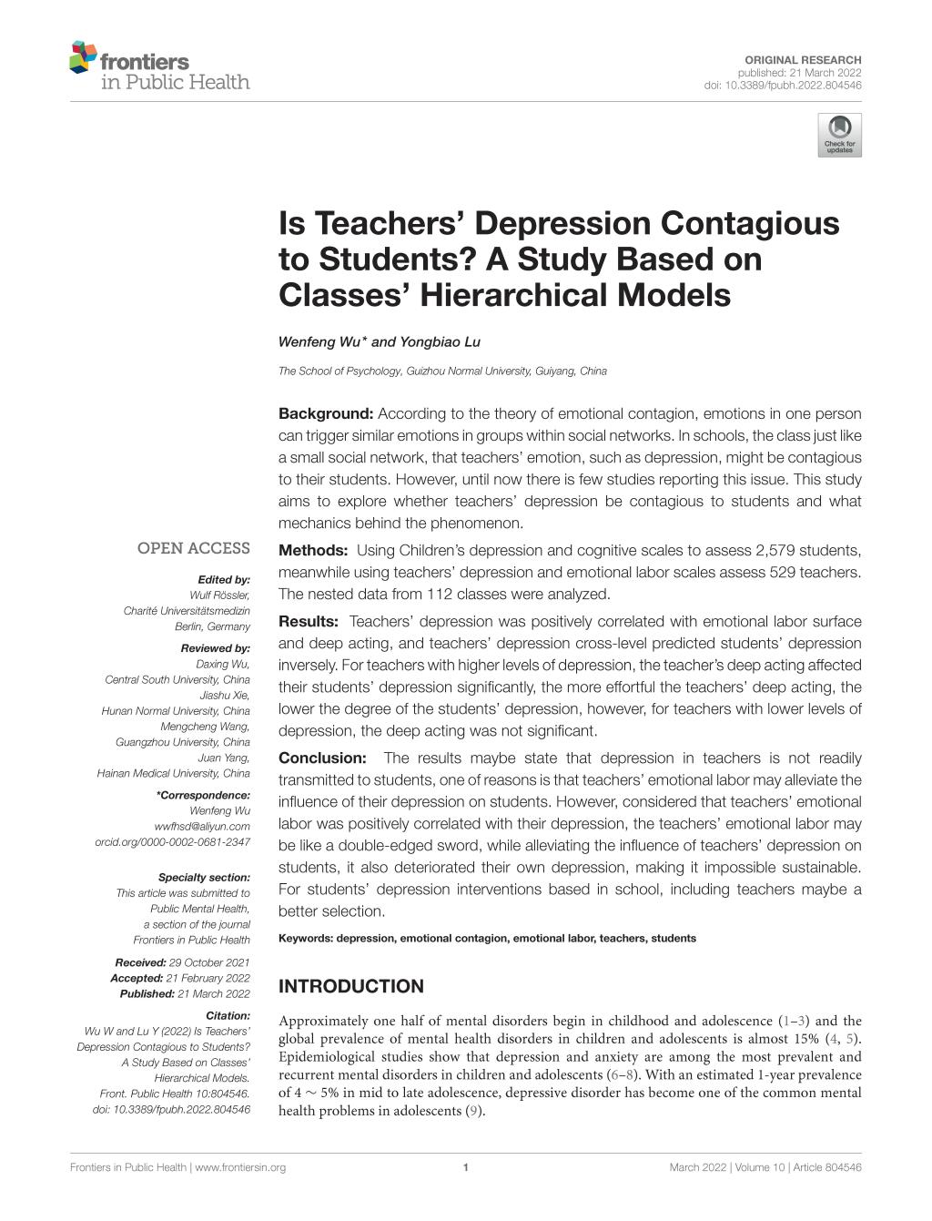 3.吴文峰教授作为第一作者,卢永彪副教授作为第二作者,2022年3月在SSCIJCR一区期刊《Frontiers inPublicHealth》发表了题为“Is Teachers' Depression Contagious to Students? A Study Based on Classes' Hierarchical Models”的学术论文。论文主要探讨班级环境中教师抑郁是否会传染给学生这一重要问题。研究发现,教师抑郁并不会直接传染给学生,相反,班级中教师抑郁症状程度越高,学生的抑郁症状程度反而越低。研究还发现,教师情绪劳动具有跨班级层的调节作用,即高抑郁症状教师情绪劳动付出越多,其班级学生抑郁症状程度越低。由于研究发现教师情绪劳动付出与其抑郁症状程度显著正相关,因此,在学校管理中,应在看到教师情绪劳动有利于学生的同时,关注其可能对教师本身的负面影响,并通过一定的干预措施强化对教师情绪劳动付出的补偿。