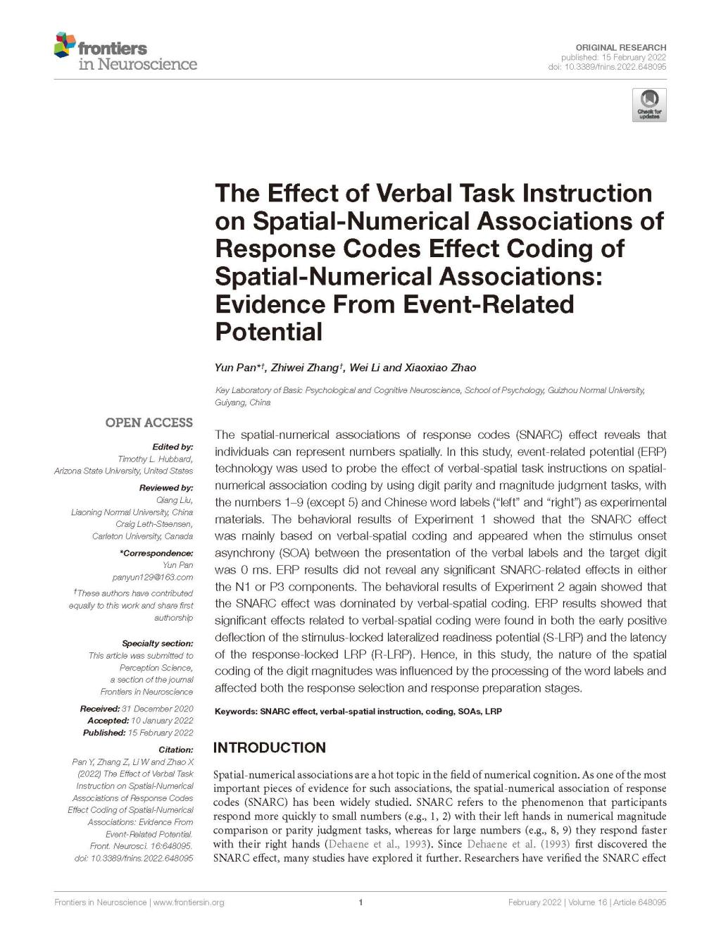 5.潘运教授作为第一作者,2022年2月在SSCIJCR二区期刊《Frontiers in Neuroscience》发表了题为“The Effect of Verbal Task Instruction on Spatial-Numerical Associations of Response Codes Effect Coding of Spatial-Numerical Associations: Evidence From Event-Related Potential”的学术论文。
