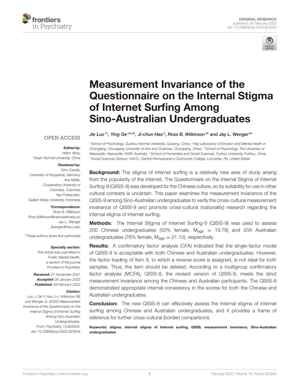 4.罗杰教授作为第一作者,2022年2月在SSCIJCR二区期刊《Frontiers in Psychiatry》发表了题为“Measurement Invariance of the Questionnaire on the Internal Stigma of Internet Surfing Among Sino-Australian Undergraduates”的学术论文。论文检验主要检验了上网内化污名问卷在中澳大学生中的测量不变性。基于验证性因子分析的结果,修订后的QISIS-8在中澳大学生中均具有较好的信效度结果,且QISIS-8在中国大学生和澳大利亚大学生中满足严格不变性。