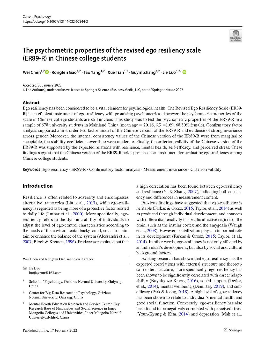 1.陈维教授作为第一作者,罗杰教授作为通讯作者,2022年2月在SSCIJCR一区期刊《Current Psychology》发表了题为“The psychometric properties of the revised ego resiliency scale (ER89‑R) in Chinese college students”的学术论文。论文考察自我韧性量表修订版(ER89-R)在中国大学生中的心理测量学属性。验证性因子分析支持ER89-R的一阶两因子结构且该结构满足跨性别的强不变性;ER89-R的内部一致性系数介于边缘到可接受之间,稳定性系数适中;ER89-R得分与心理弹性、心理健康、自我效能感和感知压力等效标之间存在相关。