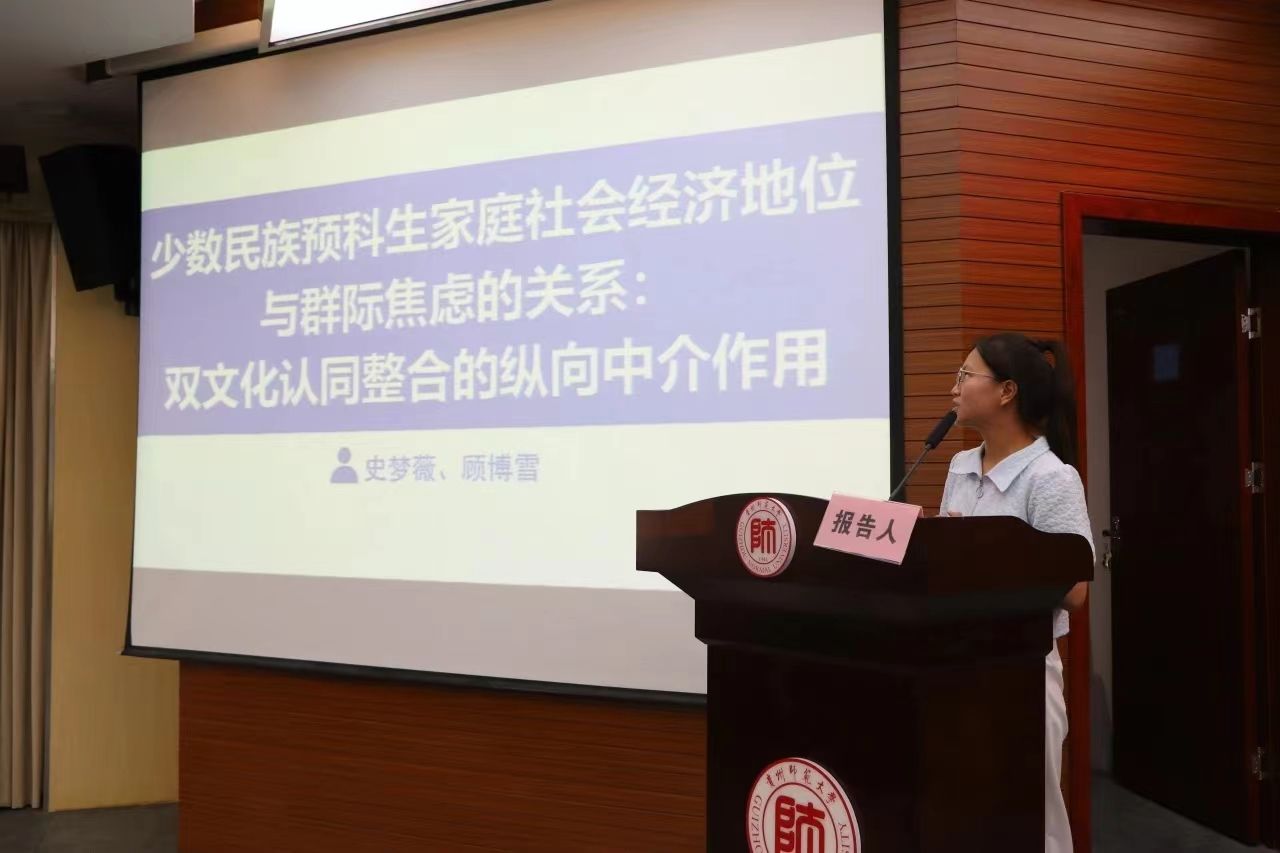 贵州师范大学心理学院本科生顾博雪分享了其导师史梦薇副教授的报告,《少数民族预科生家庭社会经济地位与群际焦虑的关系:双文化认同整合的纵向中介作用》,通过一学期前、中、末三次取样的追踪研究设计,发现少数民族预科生的家庭经济社会地位不仅能够直接预测期末的群际焦虑,还能通过期中的双文化认同整合间接预测期末的群际焦虑水平。