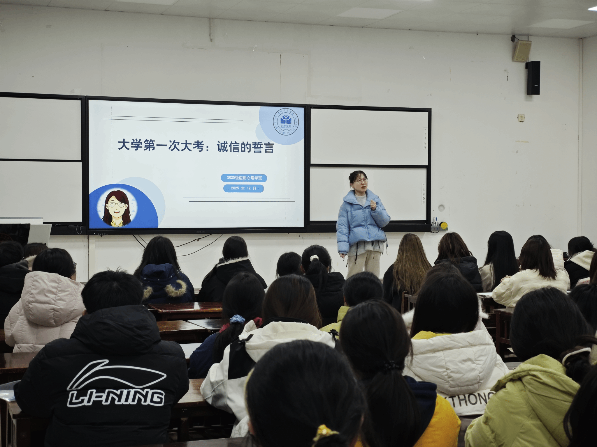 为切实增强学生诚信意识、严肃考风考纪。12月24日晚,心理学院2025级在公教3211教室召开了“大学第一次大考:诚信的誓言”诚信考试主题班会。会议由辅导员高阳主持,专业班主任许爽出席,2025级全体学生参会。