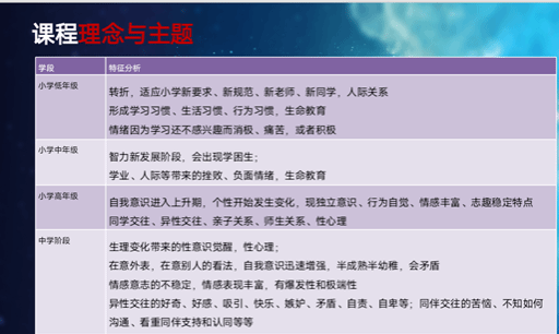 陈老师向我们介绍了课程理念和主题,将课程分为小学低年级、小学中年级、小学高年级和中学四个阶段,根据这四个阶段的不同年龄特征分析选择课程设计的主题。例如小学高年级学生正处于自我意识的上升期,个性开始发生变化,情感丰富。异性交往、亲子关系、师生关系、性心理等就是适合该阶段学生的课程主题。