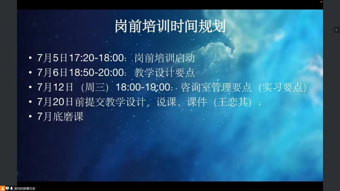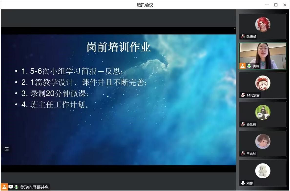 小组成员与陈美玲老师以腾讯会议的形式开展了实习岗前培训启动会。会议开始,陈老师向大家进行了简单的自我介绍,对实习岗前培训的方案进行了具体的时间规划,给我们布置了岗前培训作业以及说明最后阶段岗前培训的考核标准,并强调要做好每一次的岗前培训记录。