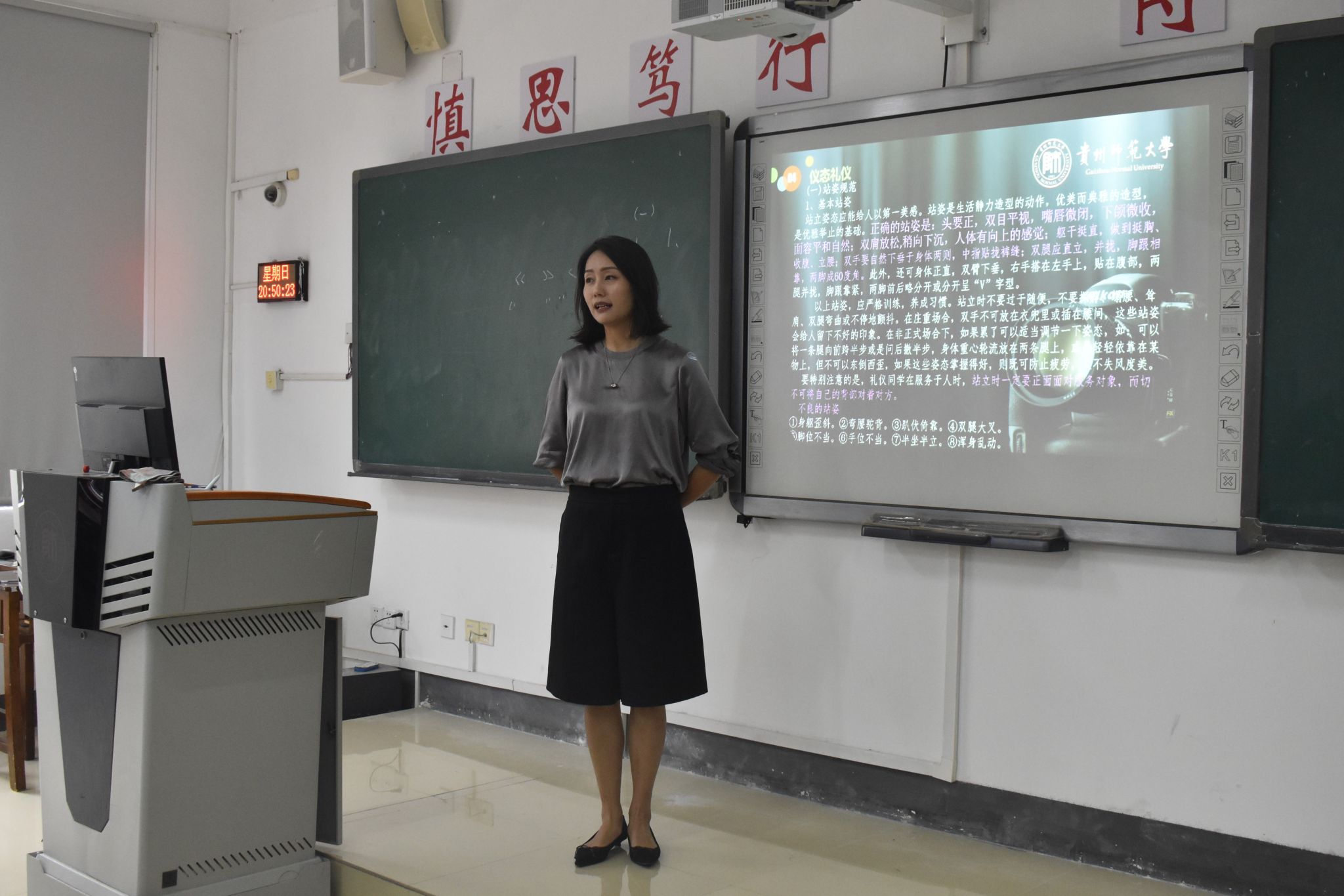 随后,饶老师从专业角度解析入职在岗后的日常礼仪规范。她首先说明礼仪行为规范在日常生活以及在职场活动中的重要意义,指出礼仪交流中尊重,真诚,宽容,从俗,适度的基本原则。紧接着,从发型、面部、坐姿、站姿、行姿、着装、言谈、手势等方面具体讲解礼仪规范相关要求,为大家普及了礼仪常识,并就学校日常工作中需要特别注意的细节问题做了详细讲解。在示范交流过程中,组织参训人员进行了现场练习。