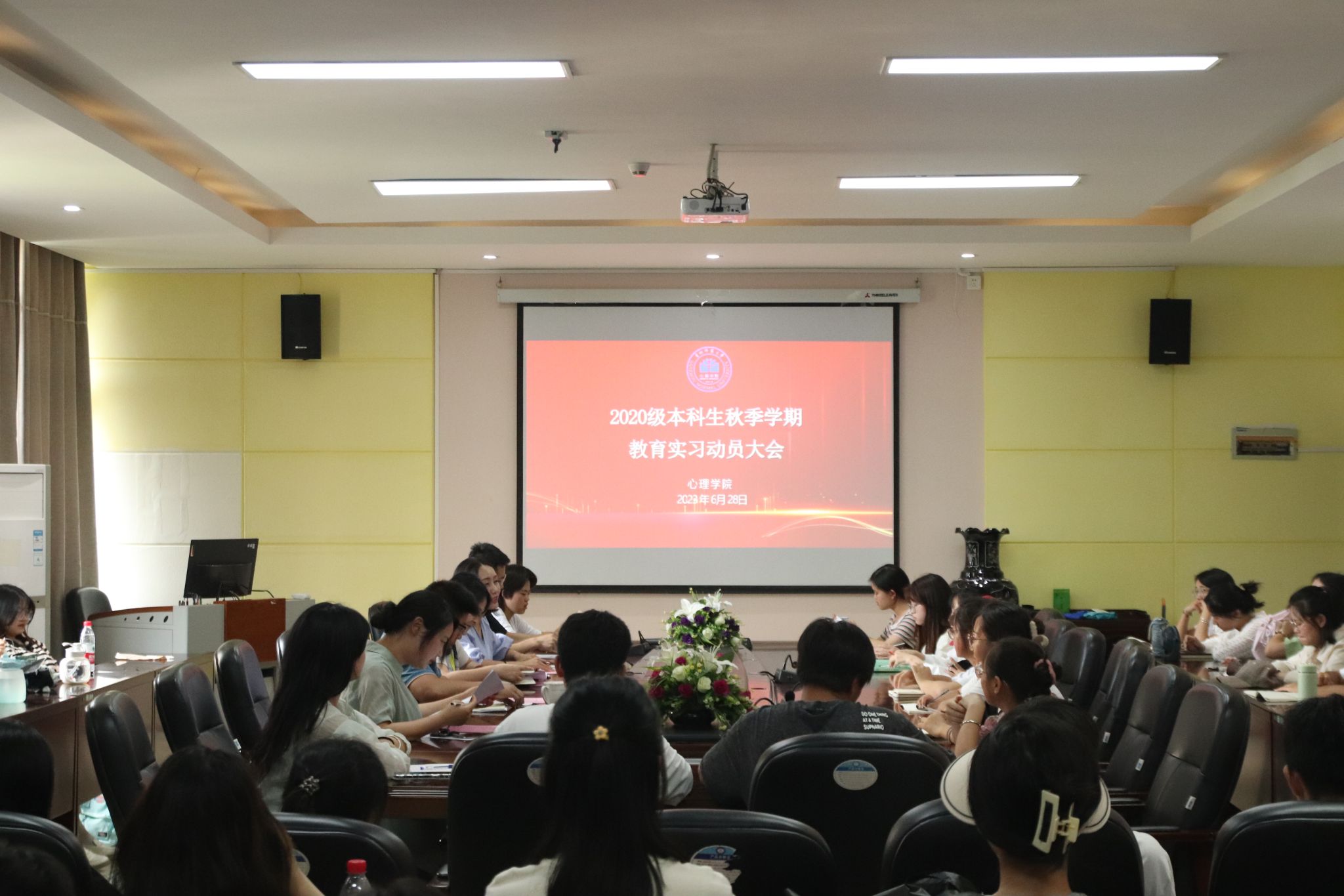 6月28日下午,心理学院于学院2302会议室召开2020级本科生秋季学期教育实习动员大会。学院党委书记杨建原、党委副书记饶蕾、副院长陈维、2020级应用心理学班辅导员姚成奎、班主任王芳及2020级应用心理学班全体同学生参与会议。会议由饶蕾主持。