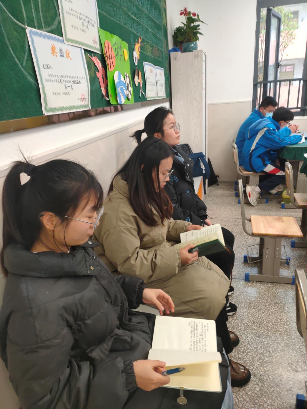 四位同学分别根据自己班主任的安排和指导进行相关的班主任工作。如课间操组织各自班级的同学排队下楼,下午监督各班班级打扫卫生等。其中,在九三班进行实习班主任工作的张玲,在班主任田老师出差后,认真管理班级,和学生家长及时进行沟通;在七(17)班的杨雯写了特色班级建设的方案,并且逐步进行了实施。