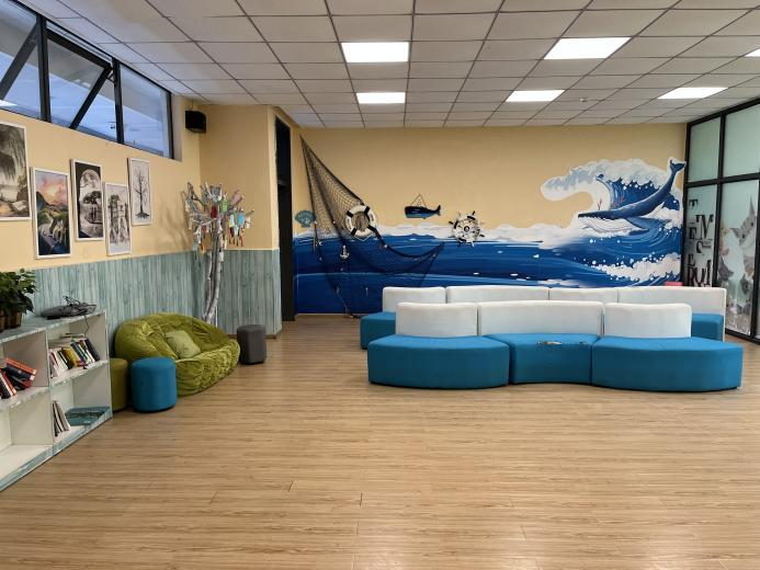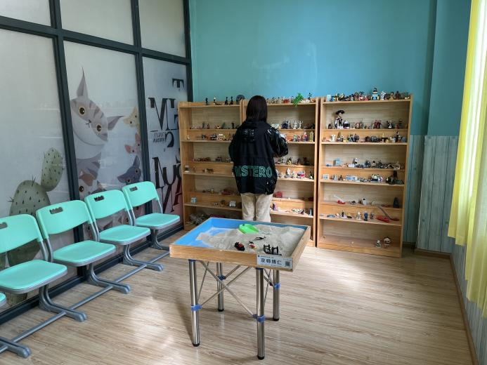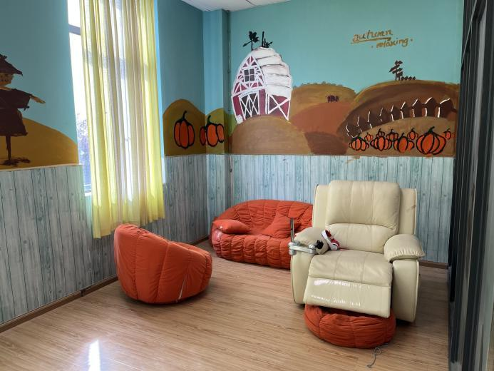 姚老师和实习小组实习生初步沟通交流之后,带实习小组的同学们参观了一下校园情况。主要包括:心理健康教室、教务工作室、食堂以及主要的办公区域等。