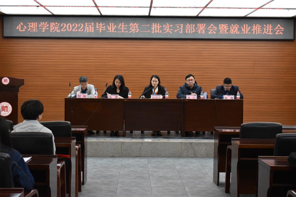 为进一步部署2022届本科毕业生第二批次实习及积极推进毕业生就业创业工作,3月11日上午,心理学院在花溪校区会议中心二楼召开2022届毕业生实习部署会暨就业推进会。学院党委书记杨建原,党委副书记、院长潘运,党委副书记饶蕾,副院长陈维,教学管理科科长盖磊,团委书记高阳,应用心理学系主任程刚及2022届全体本科毕业生参加会议。会议由饶蕾主持。