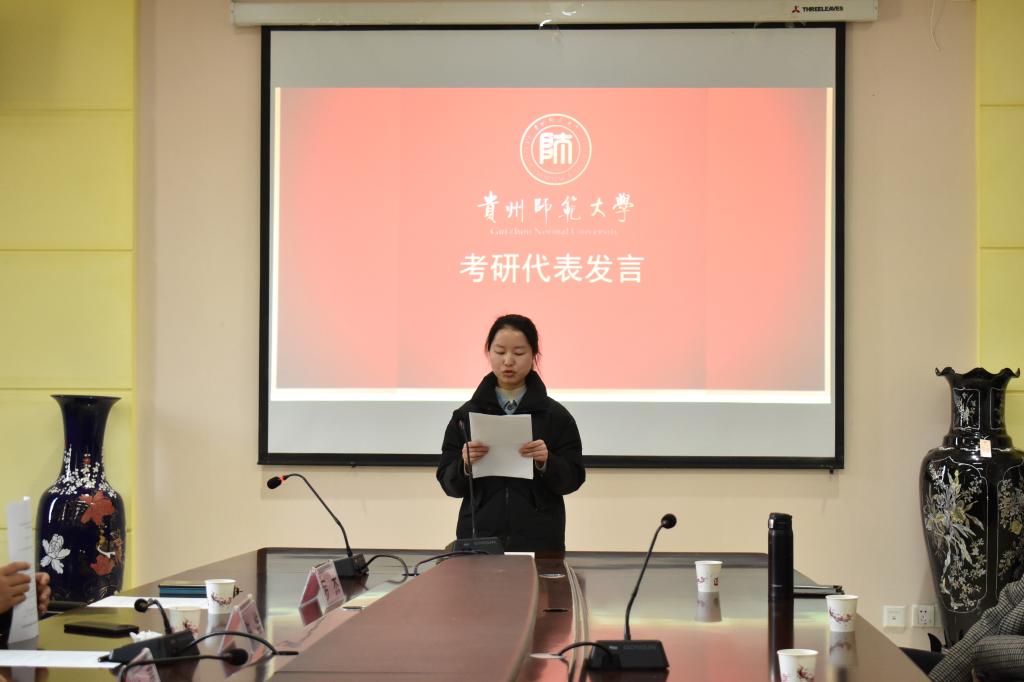 考研学生代表黄静作了交流发言。她以自身的考研动机为例,讲述了备考过程中的艰辛,也表达了为了理想不言放弃的决心和勇气。她向考研路上学院以及老师、同学们给予的关心与鼓励由衷地表示感谢,为即将迈进考场的同学们加油打气,祝愿全体考研同学旗开得胜、金榜题名。