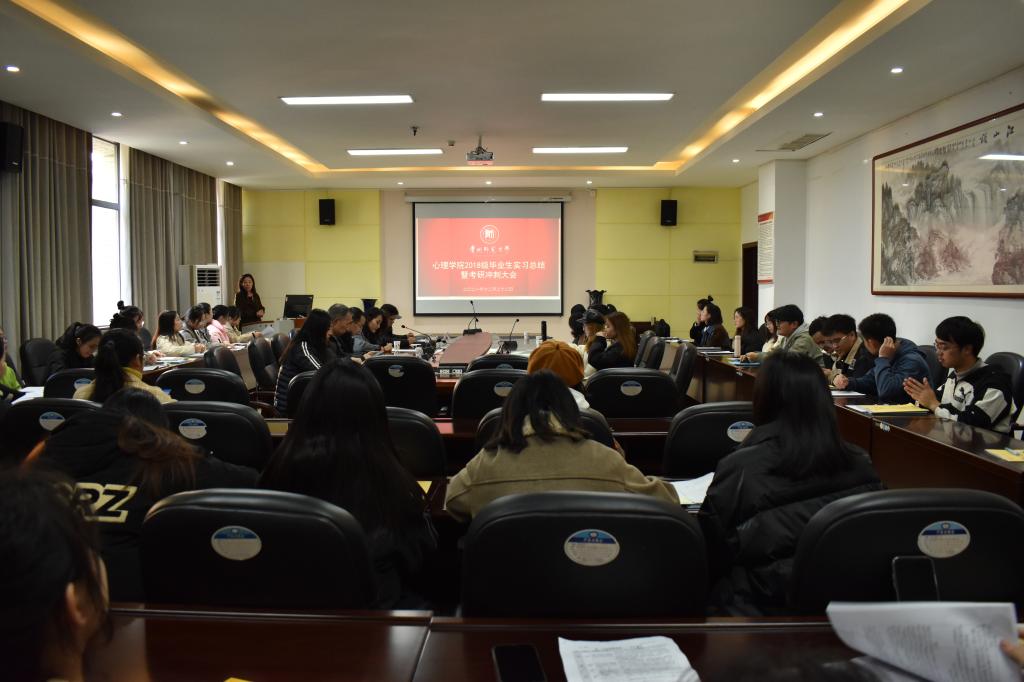 12月22日,心理学院在学院三楼会议室召开了2018级毕业生实习总结暨考研冲刺大会。心理学院党委副书记饶蕾,副院长罗禹、陈维,学科建设主任曾练平,心理学系主任罗杰,教学管理科科长盖磊,学院实习指导老师代表,2018级辅导员张晓芬及2018级全体同学参会。会议由陈维主持。