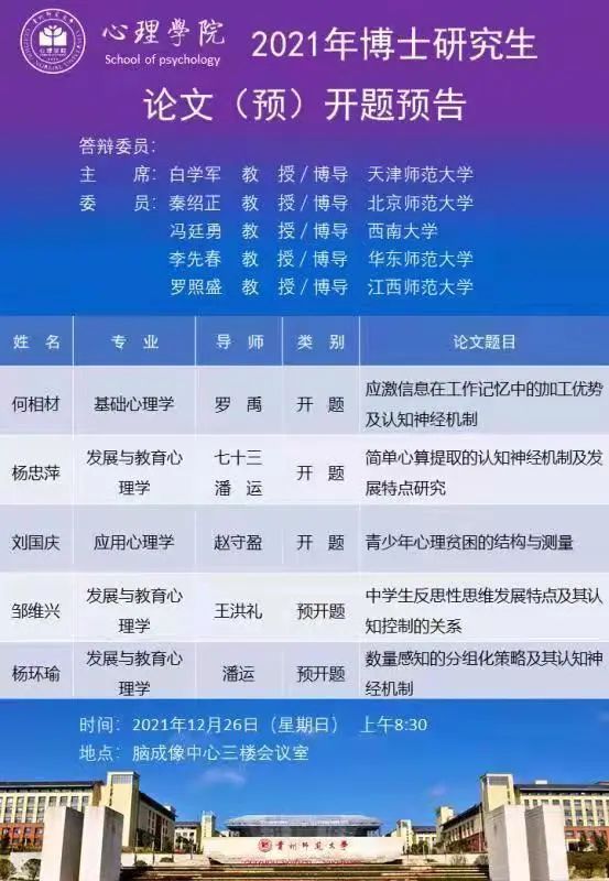 心理学院2021年博士研究生论文(预)开题预告