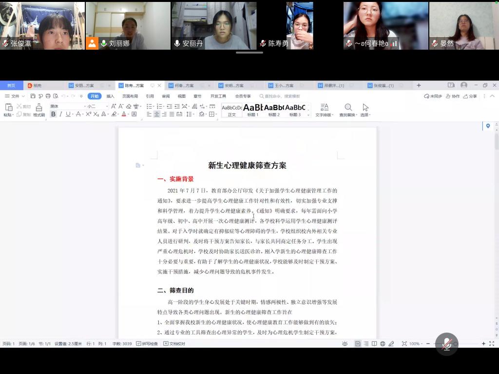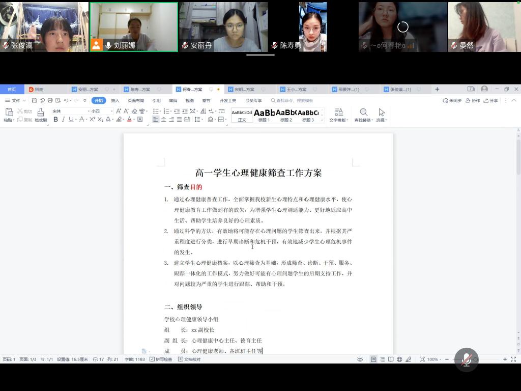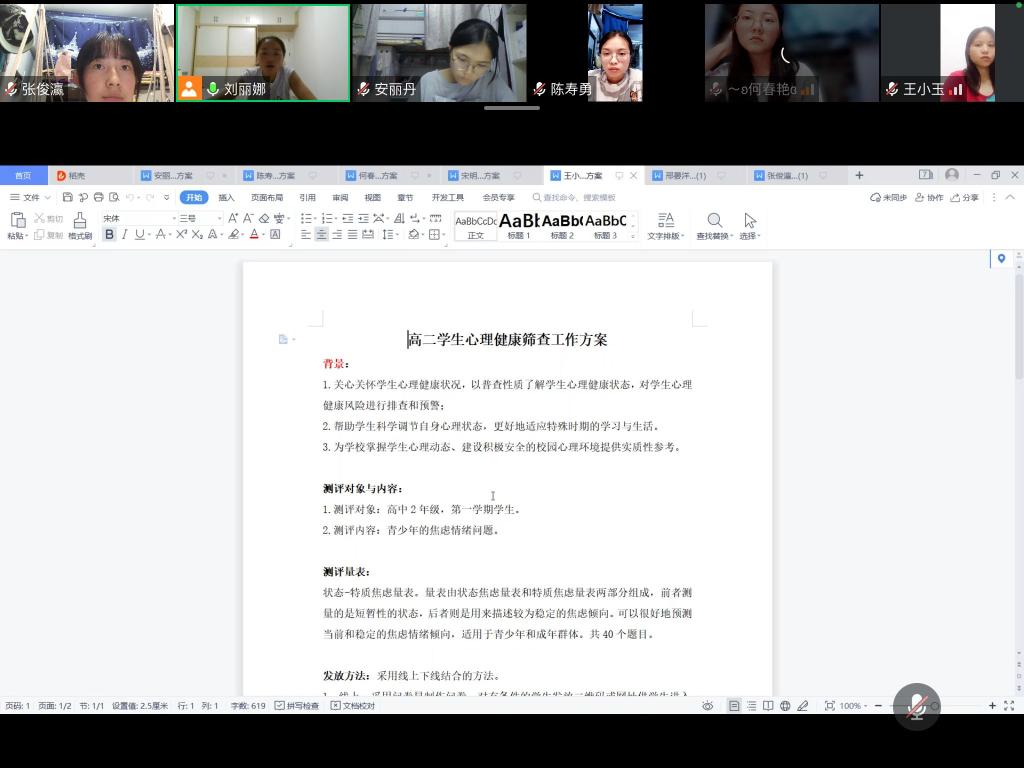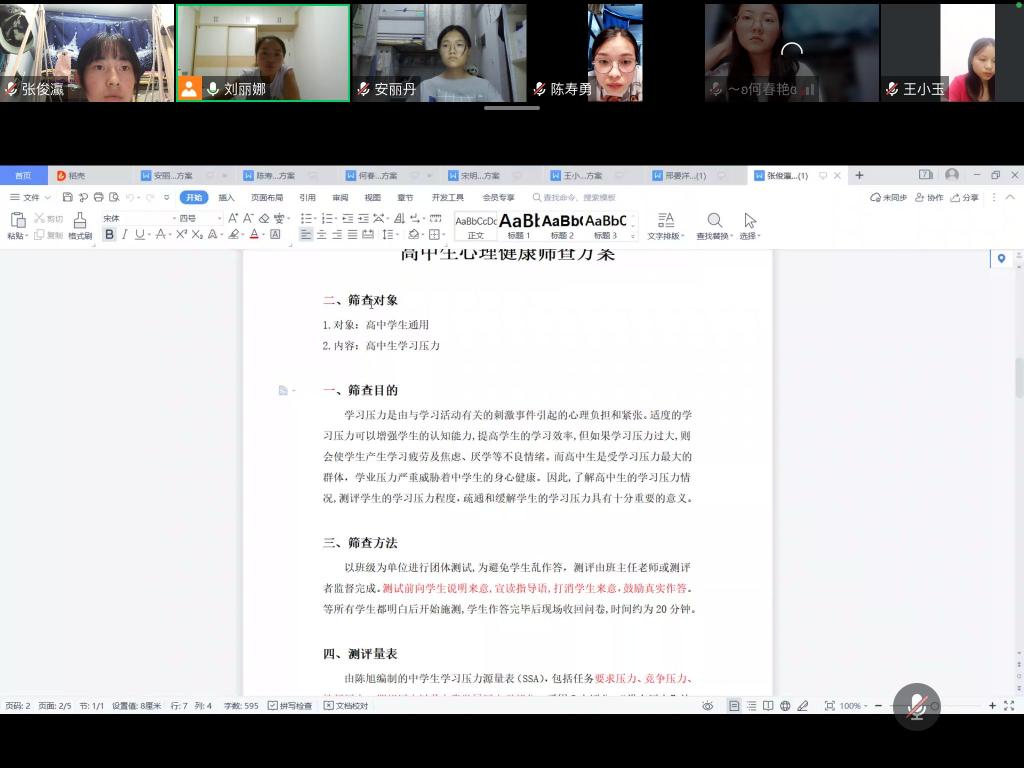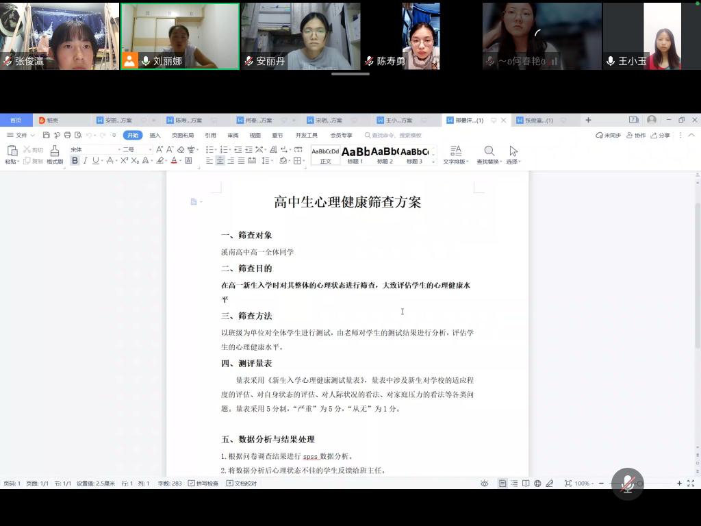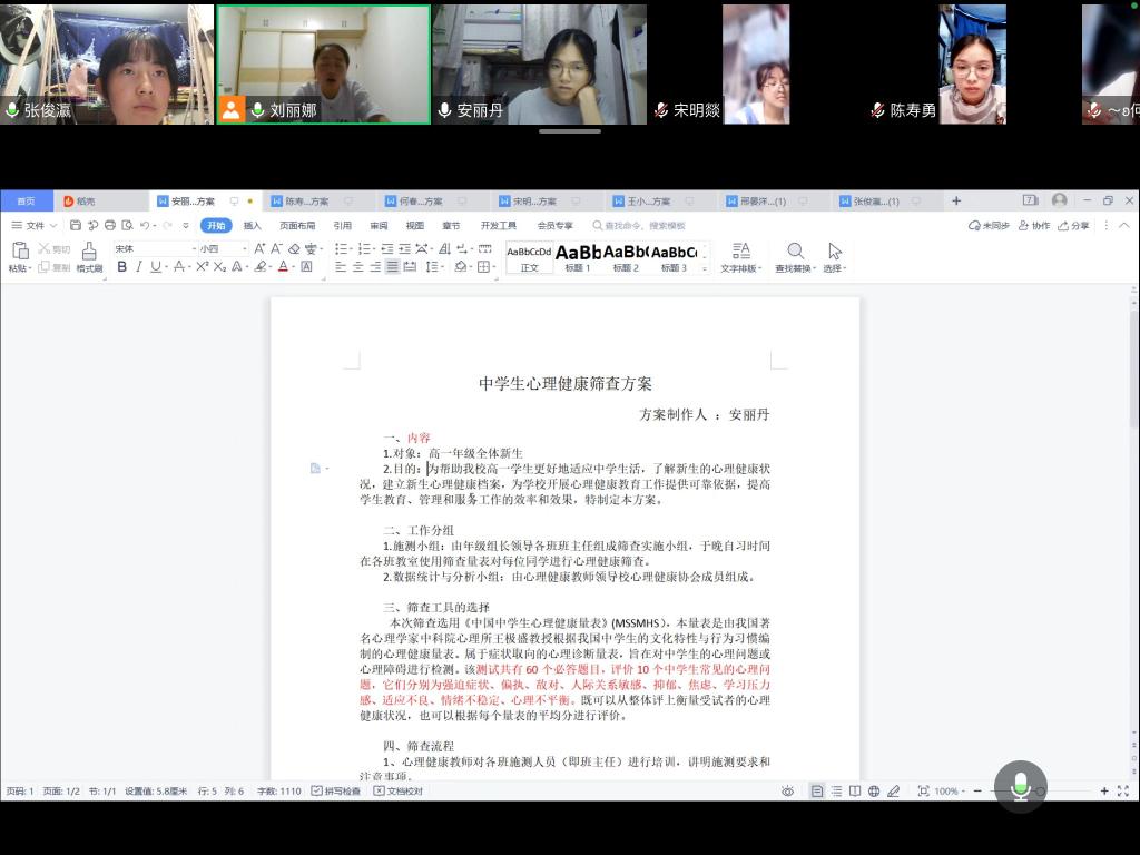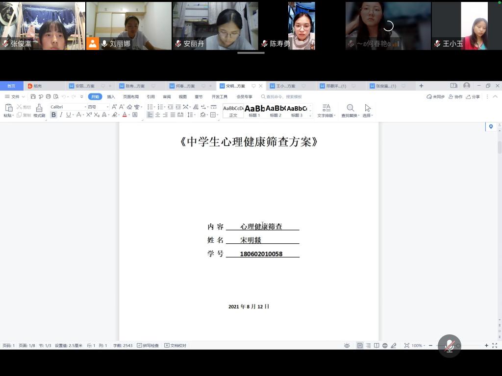 8月13日20:00,第十小组在刘老师的组织下在线上开展第四次指导会议。根据刘老师建议,本小组成员对自己的教案进行完善和修改,确定最终教案和PPT,同时,刘老师逐个分析小组成员关于中学生心理健康筛查方案的优点和不足,提出修改意见,并对下一阶段工作进行安排。