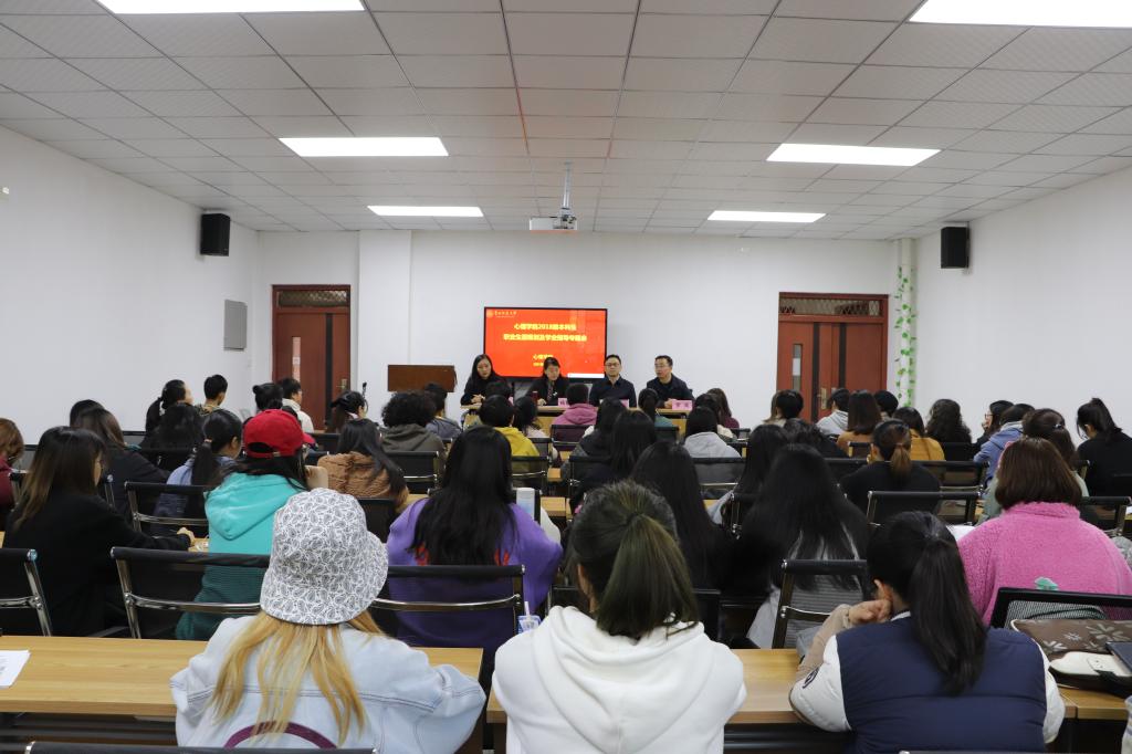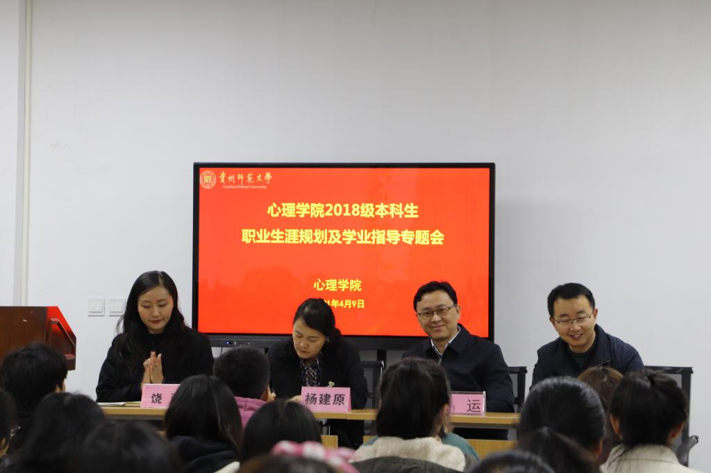 4月9日下午,心理学院于花溪校区心理健康教育与咨询中心汇报厅开展了2018级本科生职业生涯规划及学业指导专题会。学院班子成员、2018级辅导员及全体学生参会,会议由院党委副书记饶蕾主持。