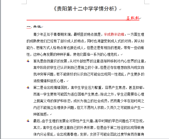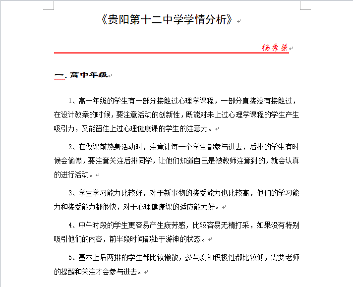 为加深对十二中学生的了解,在实习过程中,罗媛老师带领实习生吕飘飘和杨秀荣听课,并提醒在听课过程中注意观察学生的上课状态,观察学生的上课氛围及对课堂的参与度等等,分析每一个班级特点和学生特点,写出对每一个班的学情分析,最后总结学生学情情况。